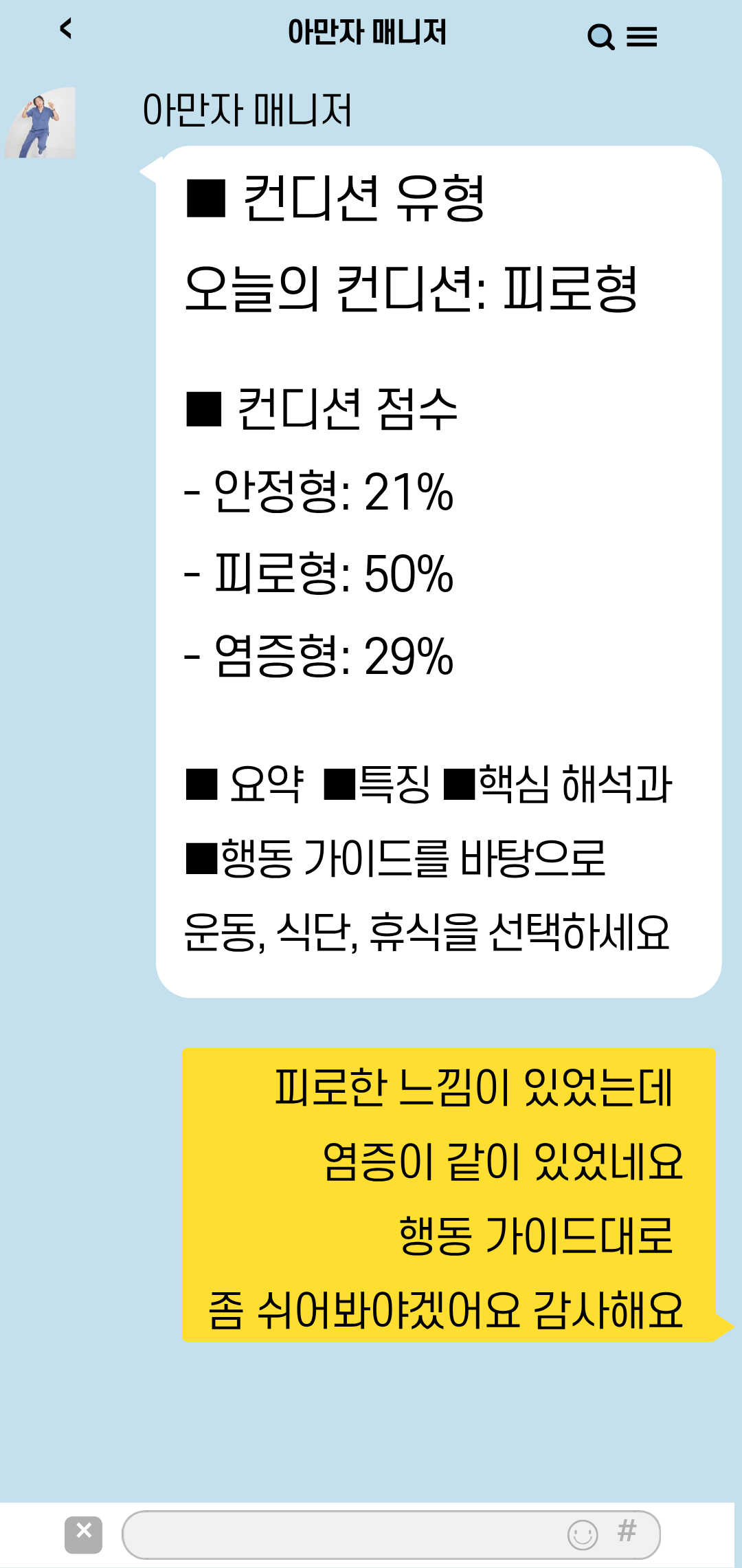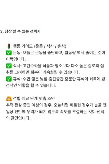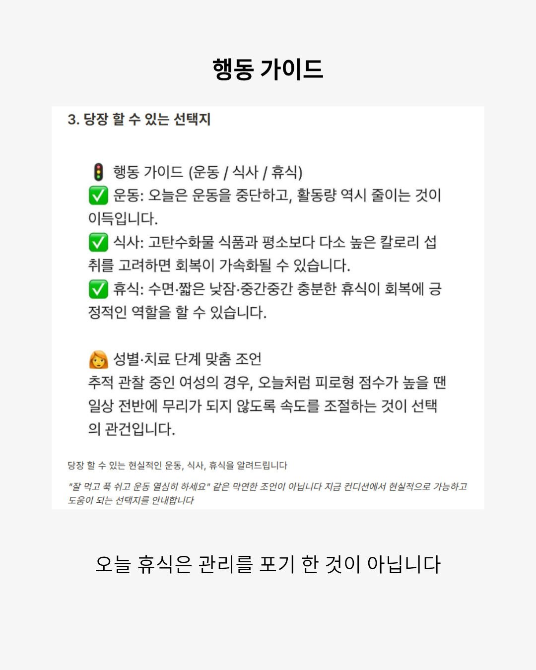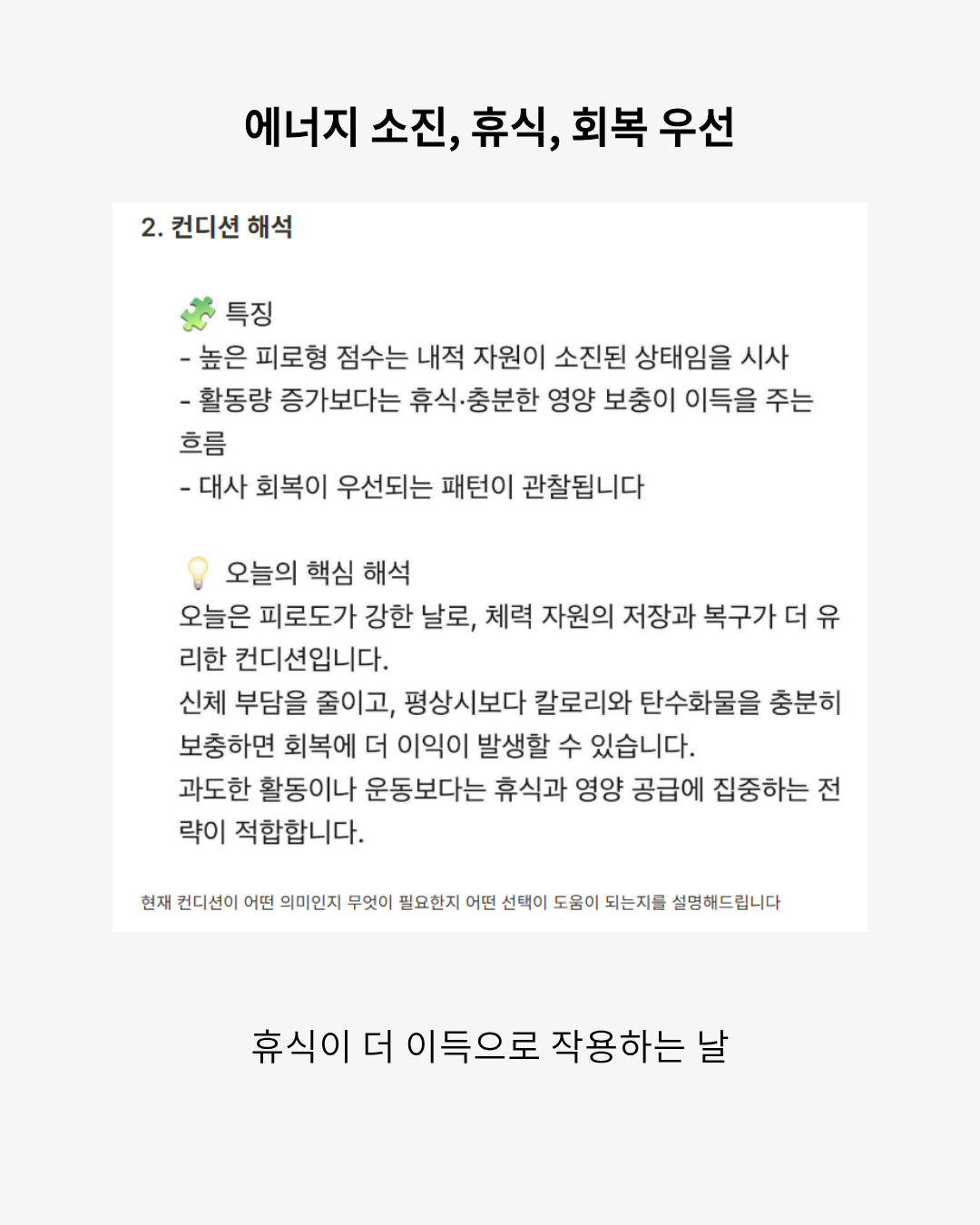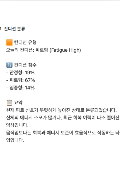 오늘은 운동을 해도 될까? 먹어도 될까? 쉬면 안 되는 날은 아닐까? 본인만의 기준으로 파악 세 가지 유형의 컨디션으로 선택을 도와드립니다