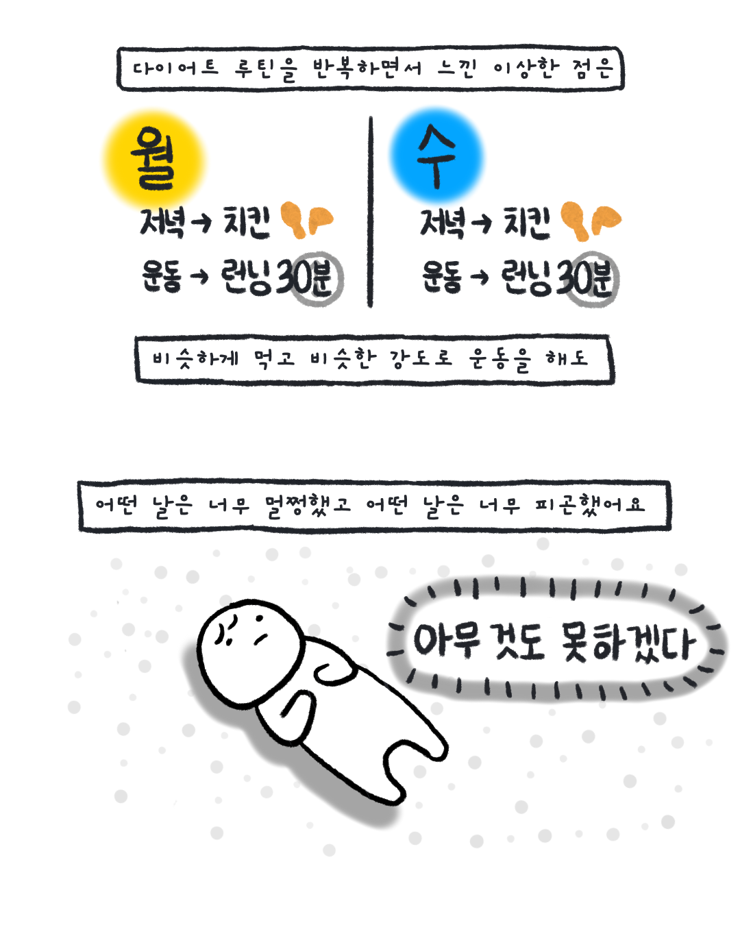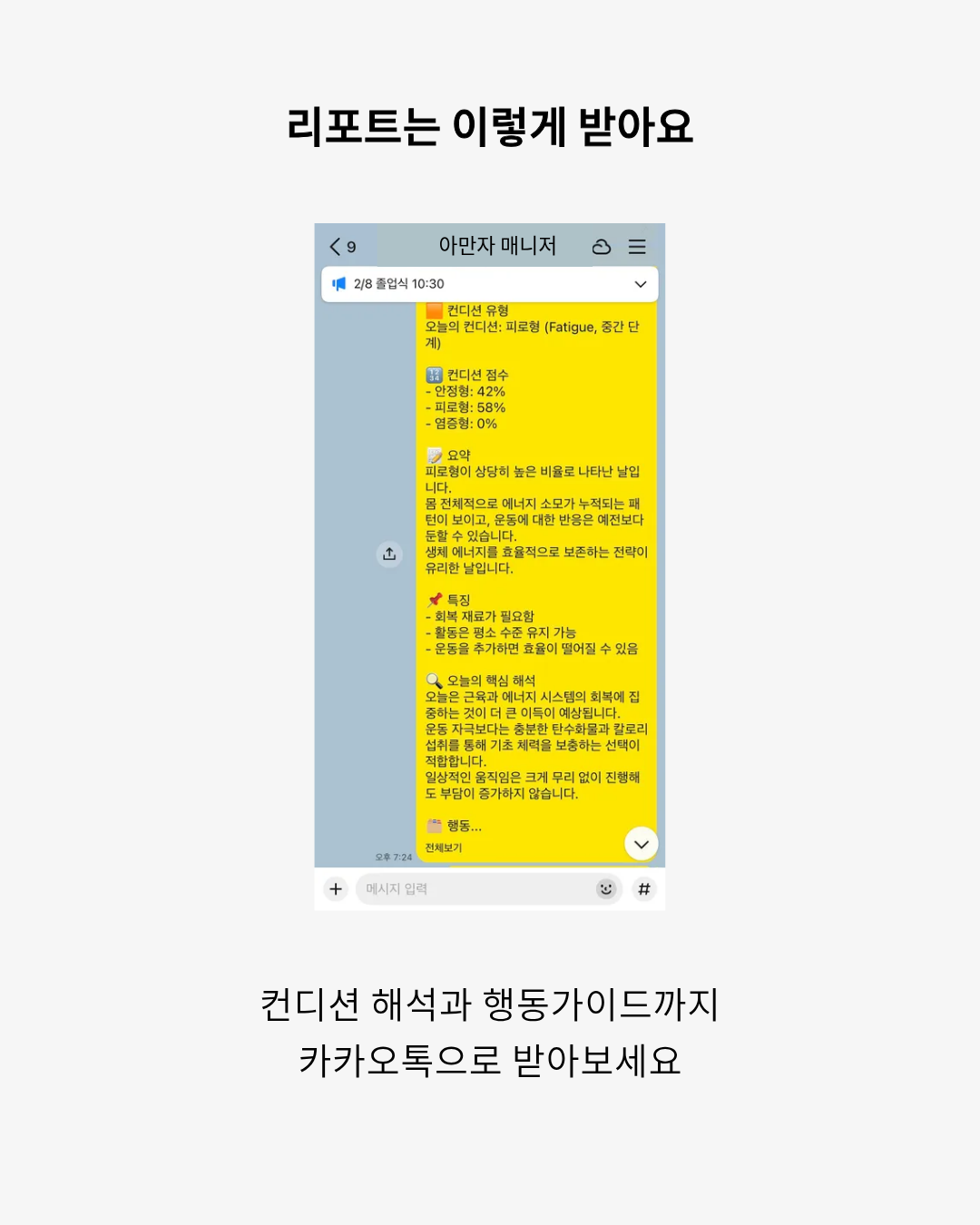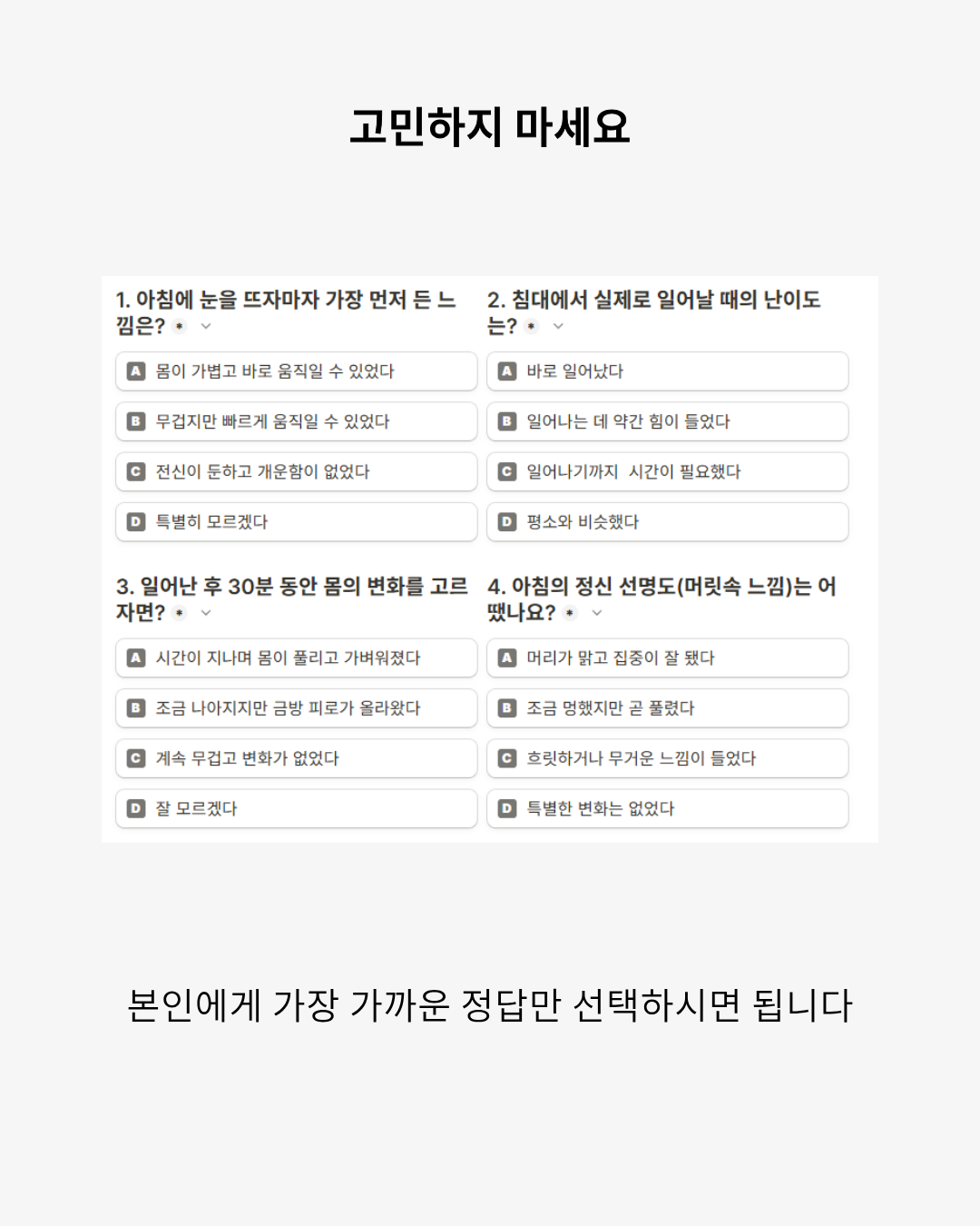 오늘은 운동을 해도 될까? 먹어도 될까? 쉬면 안 되는 날은 아닐까? 본인만의 기준으로 파악 세 가지 유형의 컨디션으로 선택을 도와드립니다